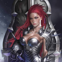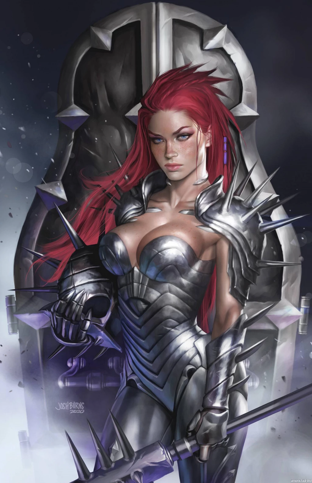 a female character with red hair, who is dressed in armor that appears to be inspired by fantasy or science fiction genres. She has a confident and assertive posture, holding a sword at her side. The background suggests an epic or dramatic setting, possibly indicating she is part of some larger narrative or series.