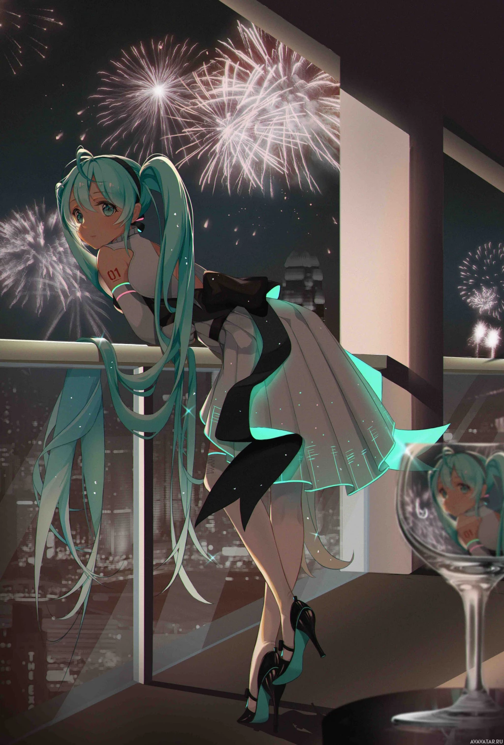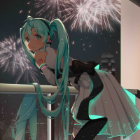anime culture. She has her head resting on her hand and appears to be looking off into the distance, possibly observing fireworks, which are visible in the background. The setting seems to be a modern balcony with