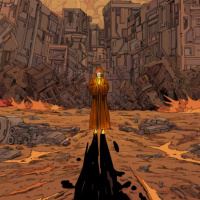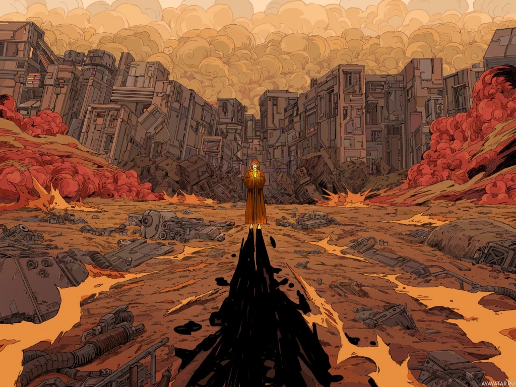 warm tones with a mix of browns, reds, and oranges, which contributes to the sense of destruction and decay. The sky appears disturbed or on fire, further emphasizing the post-apocalyptic theme.