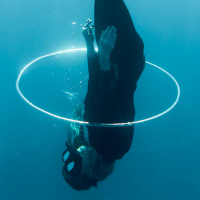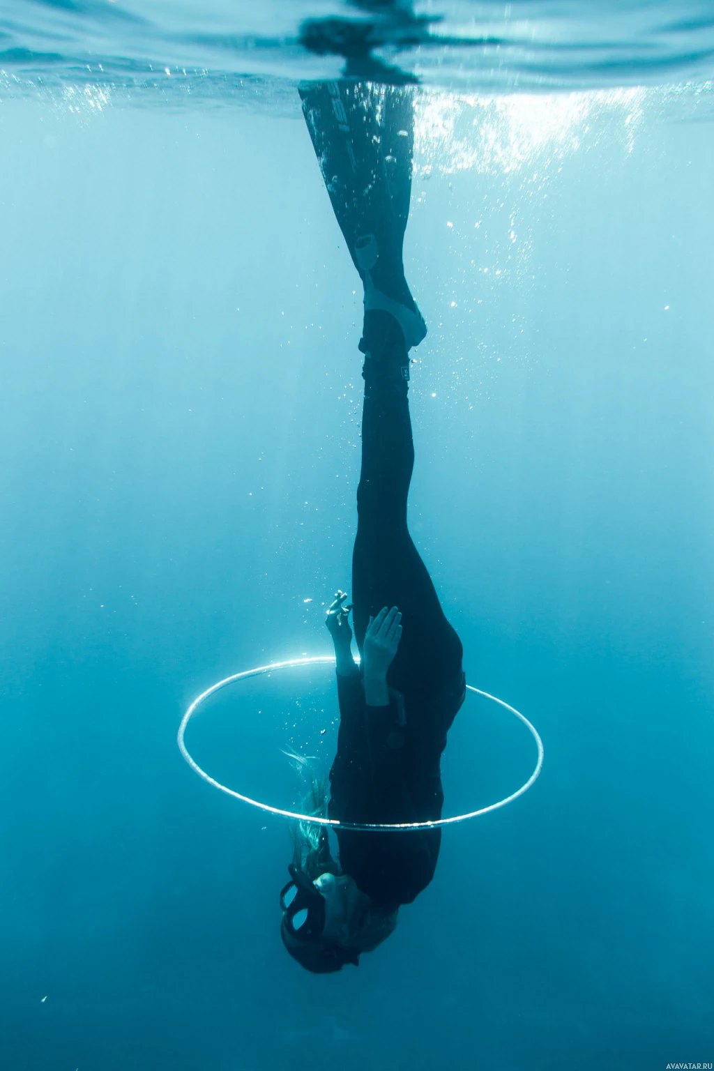 The picture shows a person, likely a woman, submerged in water while performing a ring exercise with her feet. She is upside down and has her arms extended upwards, holding onto what appears to be an object that looks like a hoop or a ring. The environment suggests she could be at the bottom of a pool or in a body of water suitable for scuba