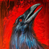 The image features a black crow in profile, with its beak wide open as if it is screeching or calling. The background is red with splatters and drips that might suggest motion or agitation. The style of the painting appears to be expressive, possibly abstract or impressionistic.