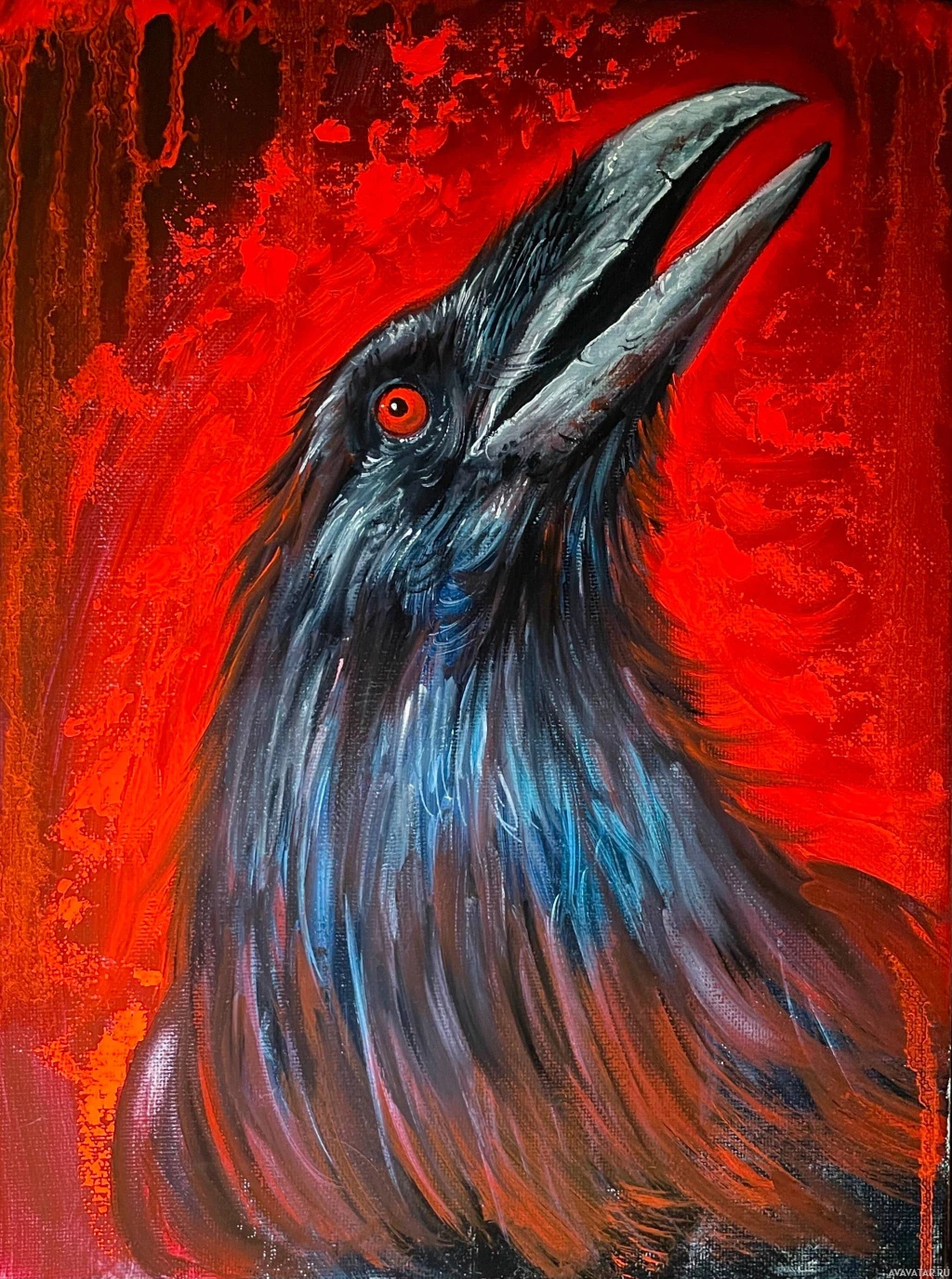 На картинке изображена черная ворона в профиль с широко раскрытым клювом, как будто она кричит или зовет кого-то. Фон красный, с брызгами и потеками, которые могут свидетельствовать о движении или волнении. Стиль картины, по-видимому, выразительный, возможно, абстрактный или импрессионистический.