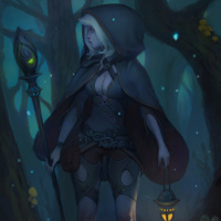 an impression of mystery or magic. She holds a lantern in one hand and a staff with what appears to be