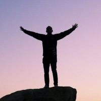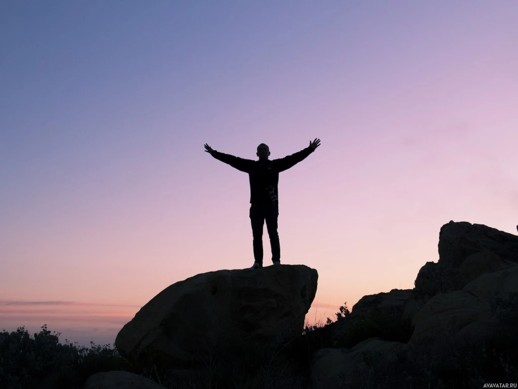 silhouette of the person is prominent against the lighter background, and they are holding their arms outstretched towards the horizon, which could suggest an act of triumph, celebration, or a sense of achievement. The