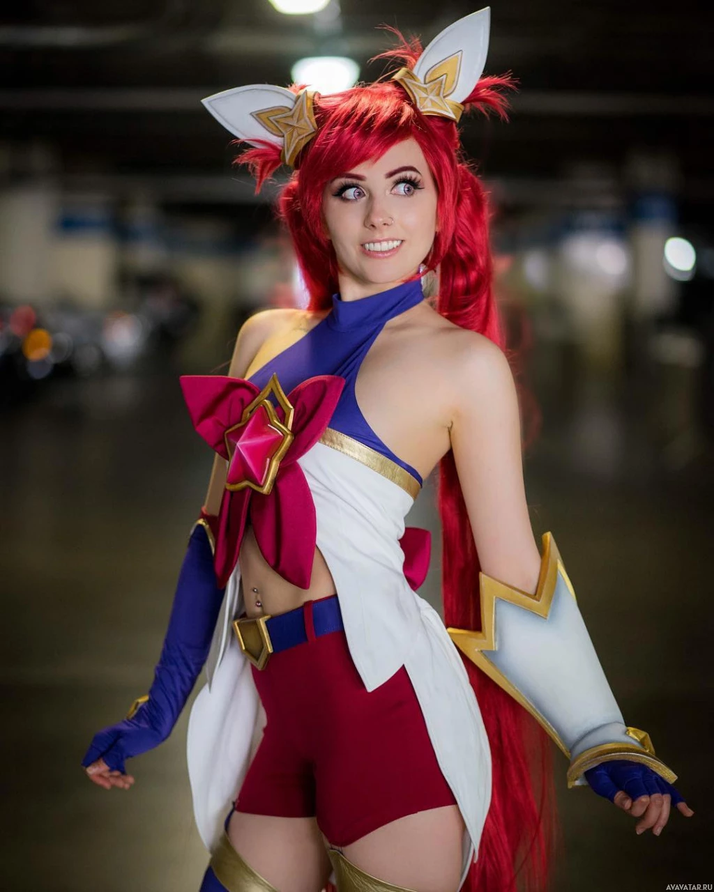 red hair, cat ears, and a colorful outfit with a bow on the back. The individual is smiling at the camera and appears to be in a garage or similar