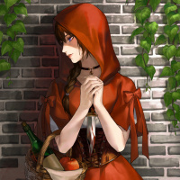 The image shows an animated character wearing a red hooded cloak and holding a basket of fruit. She is also holding a bottle, which could be interpreted as containing wine or another liquid. There is no visible knife in the image.
