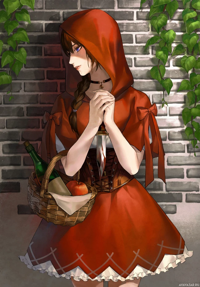 На картинке изображен анимационный персонаж в красном плаще с капюшоном и с корзиной фруктов в руках. Она также держит бутылку, которая может быть интерпретирована как бутылка с вином или другой жидкостью. На изображении не видно ножа.