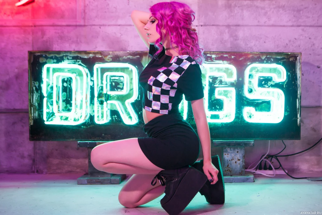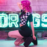 a checkered top and have their hand on their hip. The individual is posing in front of a sign that says "DRUGS." The setting appears to be