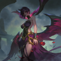 dark clothing with feather-like details on her wings and attire, which are often associated with her character's dark nature in the game. The background suggests a chaotic or battle scene, fitting her role as a cunning and powerful spellcaster within the game's universe.