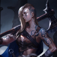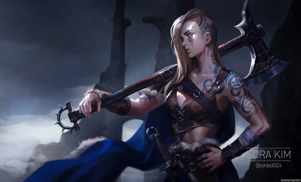 a female character with blonde hair, who appears to be armed with an axe. She has tattoos and is wearing armor that suggests she could be from a fantasy or