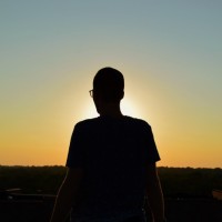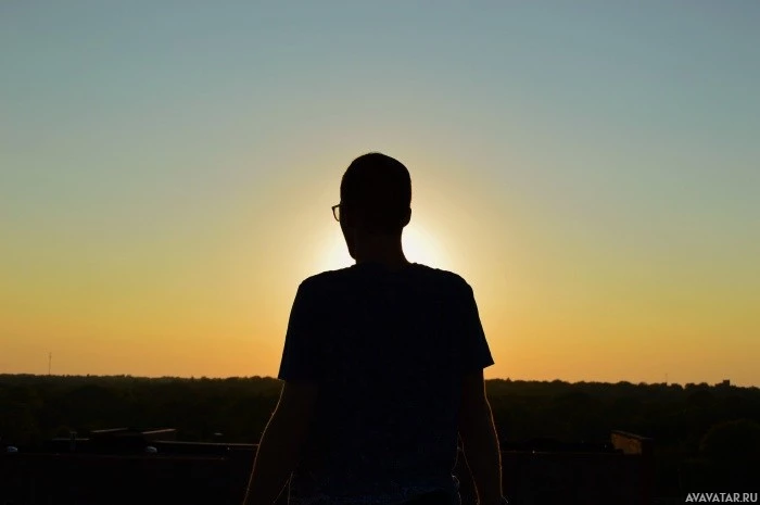 На картинке изображен силуэт человека, стоящего на фоне оранжевого неба на закате. Солнце видно на горизонте, и человек, кажется, смотрит или смотрит в сторону заходящего солнца. Градиент неба указывает на то, что это может быть либо раннее утро с восходом солнца, либо поздний вечер, когда солнце садится. Изображение представляет собой красивое изображение момента уединения в мирное время суток.