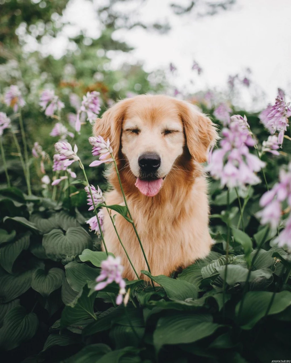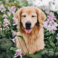 retriever dog sitting among tall flowers. It appears to be enjoying