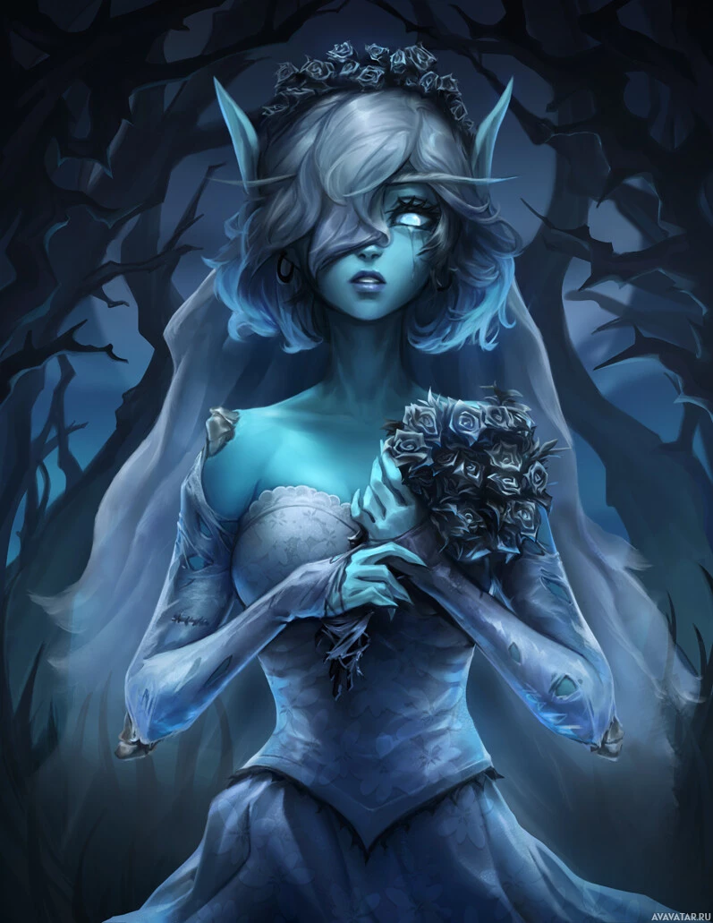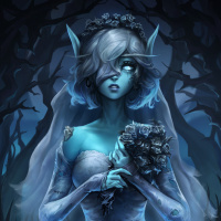 a wedding dress with a veil, indicating she may be depicted as a bride or preparing for marriage. Her expression seems thoughtful or contemplative. The background suggests a mysterious or magical environment, possibly a forest or an enchanted place, which is common in fantasy artwork to enhance the otherworldly