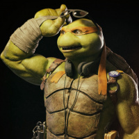 green eyes, and brown bandana around his head. His right hand is raised to his forehead in a saluting position. Michelangelo is wearing his classic turtle costume with orange straps and has