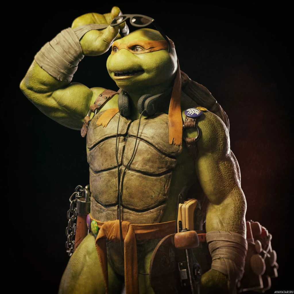 Ninja Turtles, known as Michelangelo. He is depicted with his signature yellow skin,