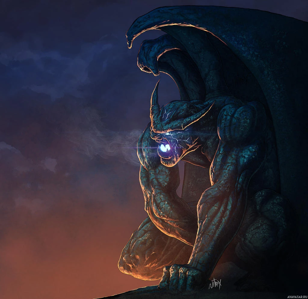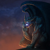 This is a digital artwork depicting a fantasy-themed gargoyle. The creature has an intricate and menacing appearance, with large wings that are curled around its body,