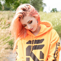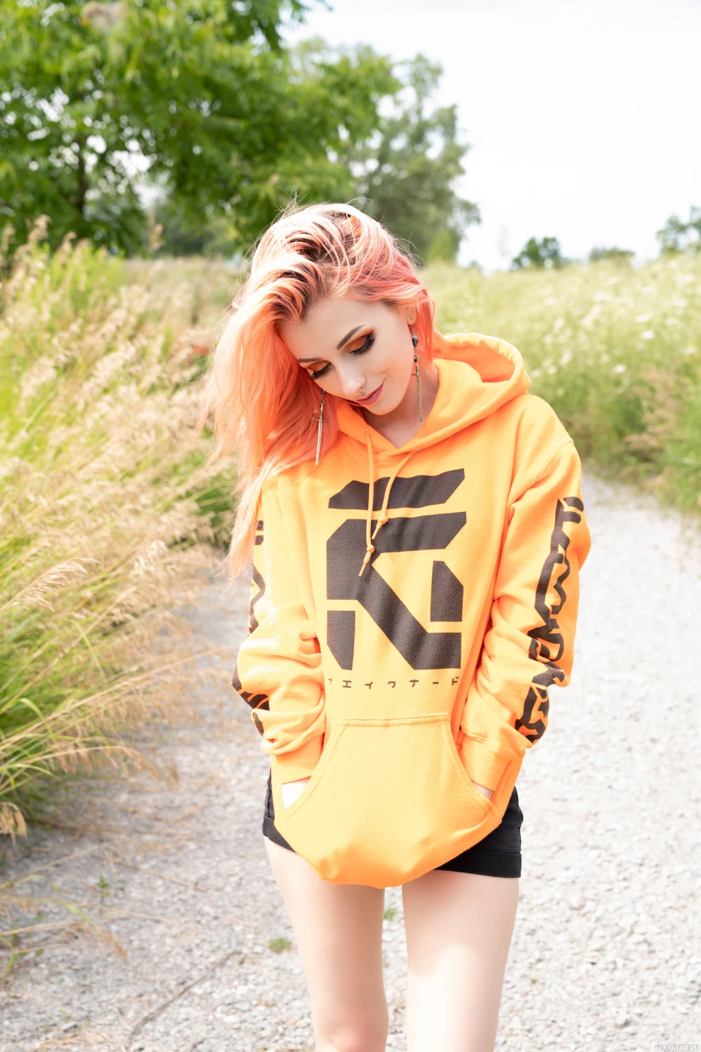 pink hair, standing outdoors. She is wearing a bright yellow hoodie with some text on it and has her eyes closed, possibly in
