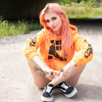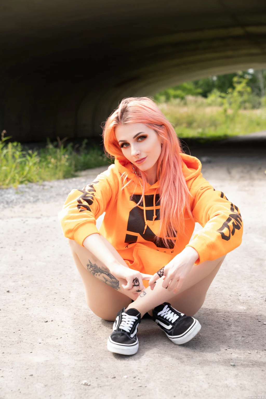 pink hair and some tattoos, sitting on the ground next to what appears to be a bridge or overpass. They are wearing