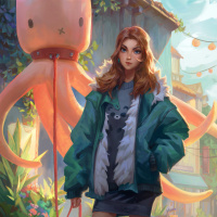 a whimsical touch to the scene. There are also some flowers and plants in the environment around her.