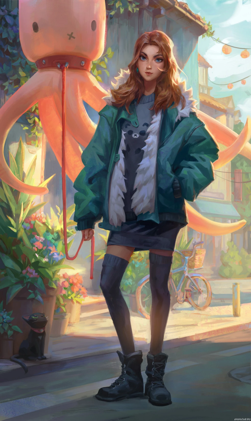 black pants and shoes. Her posture is relaxed, and she seems to be looking at something or someone off-camera. To her right, there is a large octopus balloon floating in the air, adding