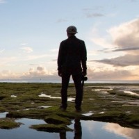 rocky terrain near the water, possibly at a coastline. The person is silhouetted against the sky and appears to be looking out towards the ocean or sea. There are