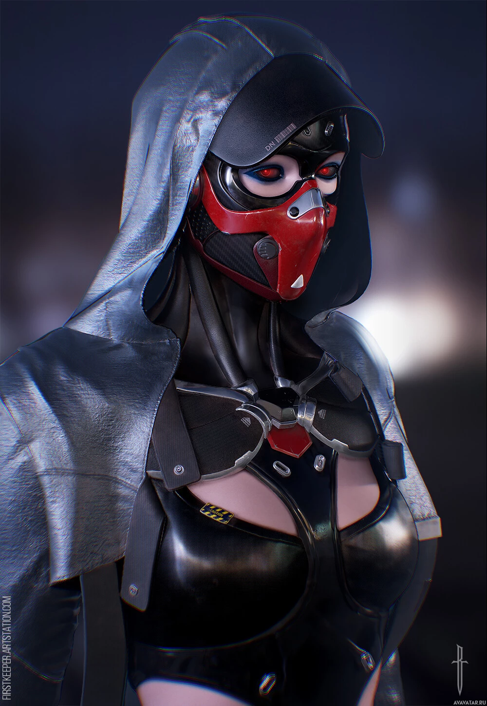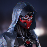 a hooded outfit with a mask. The design suggests a cyberpunk or science fiction theme. The character is also wearing a bodysuit with a metallic finish and