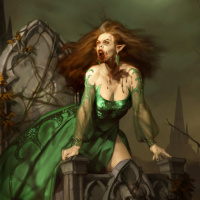 red hair, dressed in an elaborate green dress, sitting on what appears to be a tombstone or a grave. She has
