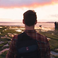 The image shows a person from behind, standing on what appears to be a beach or coastal area during the evening or