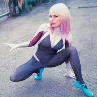 pink hair and white skin with blue accents, often depicted wearing a black and blue bodysuit with spider-like motifs. This individual is posing in an active stance, reminiscent of the Spider-Woman character's acrobatic abilities, which are portrayed in the comics as agility and