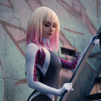 body suit with spider emblems, which are characteristic of the Spider-Woman persona that Gwen Stacy takes on in some depictions. The costume also includes