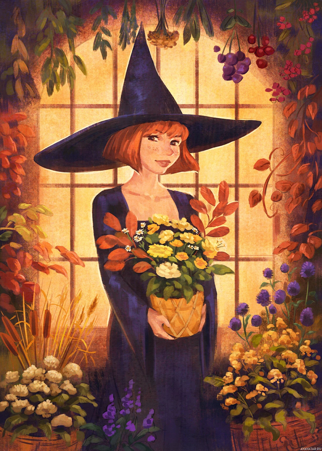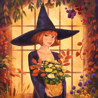 a witch hat and holding a basket full of colorful flowers. The setting appears to be an outdoor area with autumnal foliage in the background, suggesting it might be a garden or park during