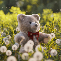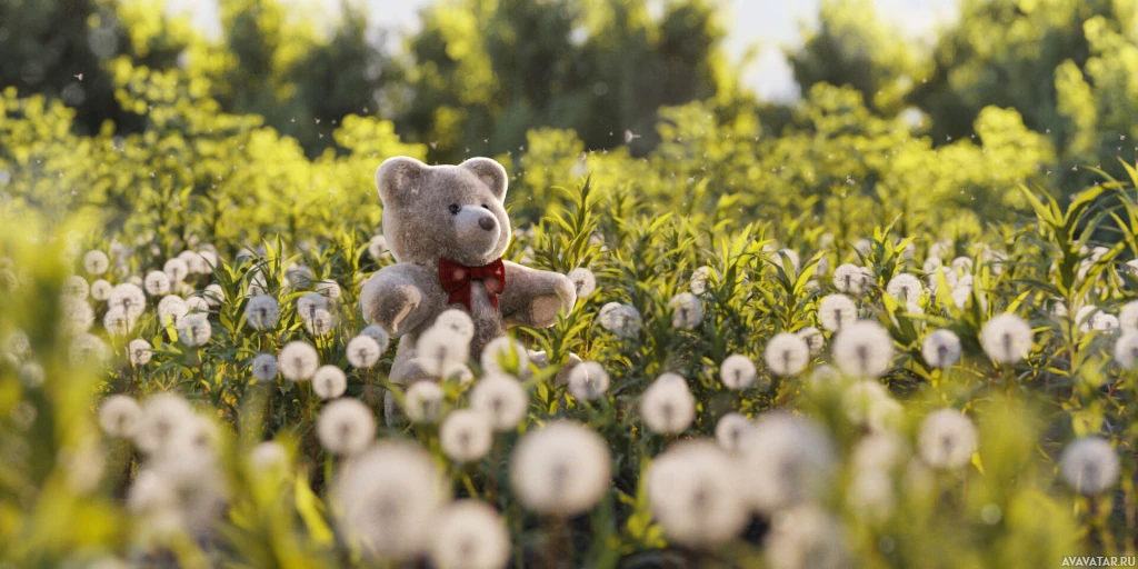 На снимке изображен плюшевый мишка, сидящий посреди поля с высокими одуванчиками. На заднем плане изображен солнечный день с зелеными полями, простирающимися до горизонта, что придает пейзажу безмятежный и причудливый вид.