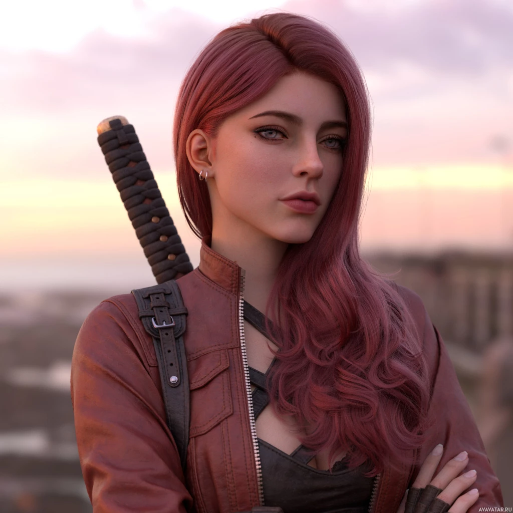 a leather jacket and has what appears to be a sword strapped across their back. They are standing against a backdrop that suggests either sunrise or sunset, given the lighting on their face. The person is looking directly at the camera with