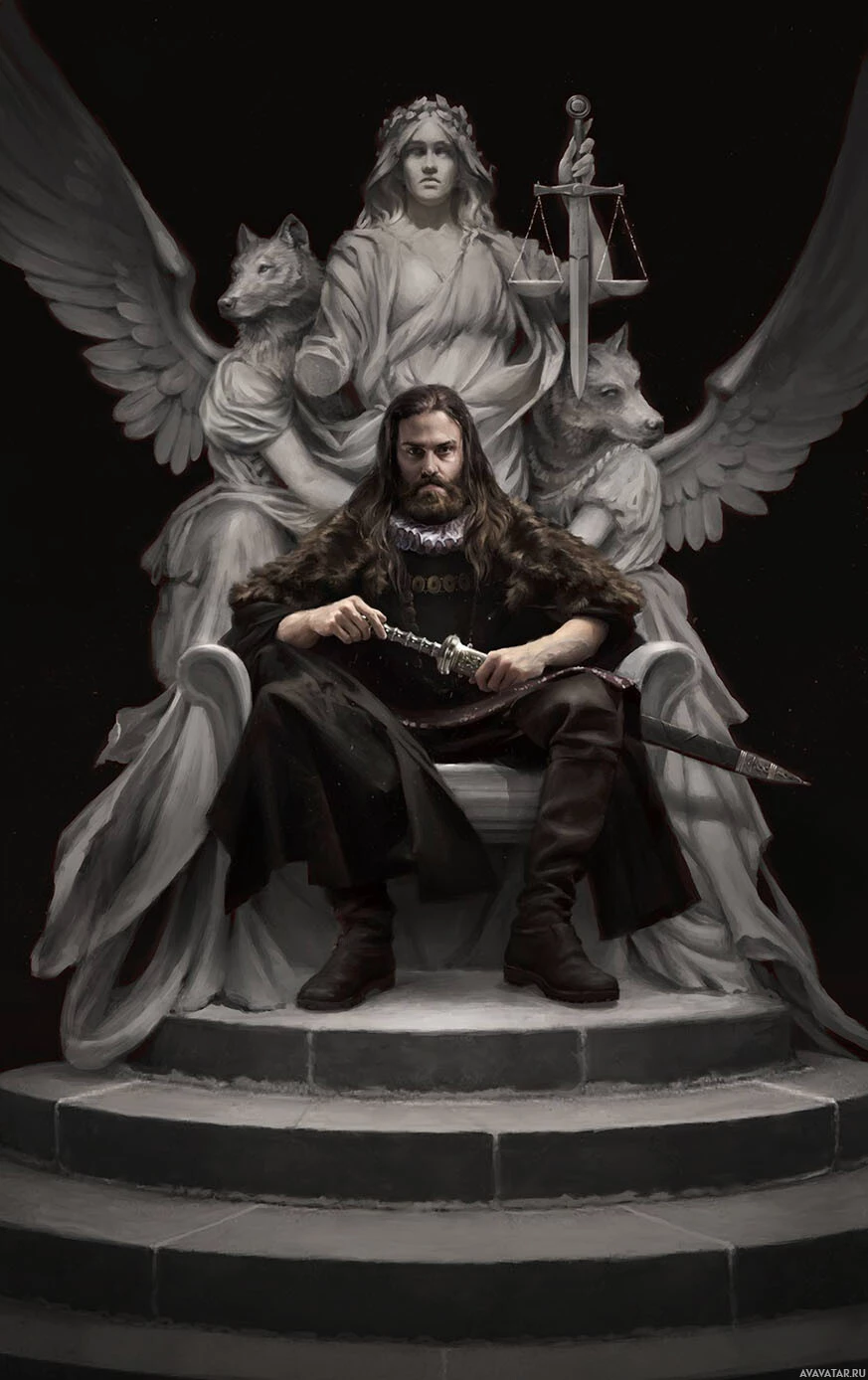 an angelic figure on either side of the throne, possibly symbolizing balance or guidance. The individual is dressed in a costume that could suggest a historical or