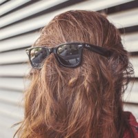 The image shows a person wearing sunglasses with their face obscured by what appears to be a bushy, shaggy hair or costume. It's not possible to determine the gender of the individual due to the full coverage of the face and head. The style of the photo gives it an artistic or comedic feel.