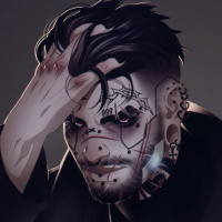 long hair, styled to one side, and his face is covered in a mixture of makeup and what appears to be blood or a similar substance. He is wearing