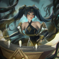 a young girl with long blue hair and twin tails, wearing a black and gold armor or costume that could suggest she is part of a fantasy story or game setting. She has