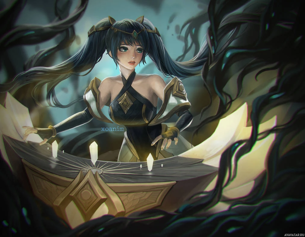 a serious expression on her face and is holding what looks like a magical staff. The background shows dark, ominous-looking elements such as roots, which add to