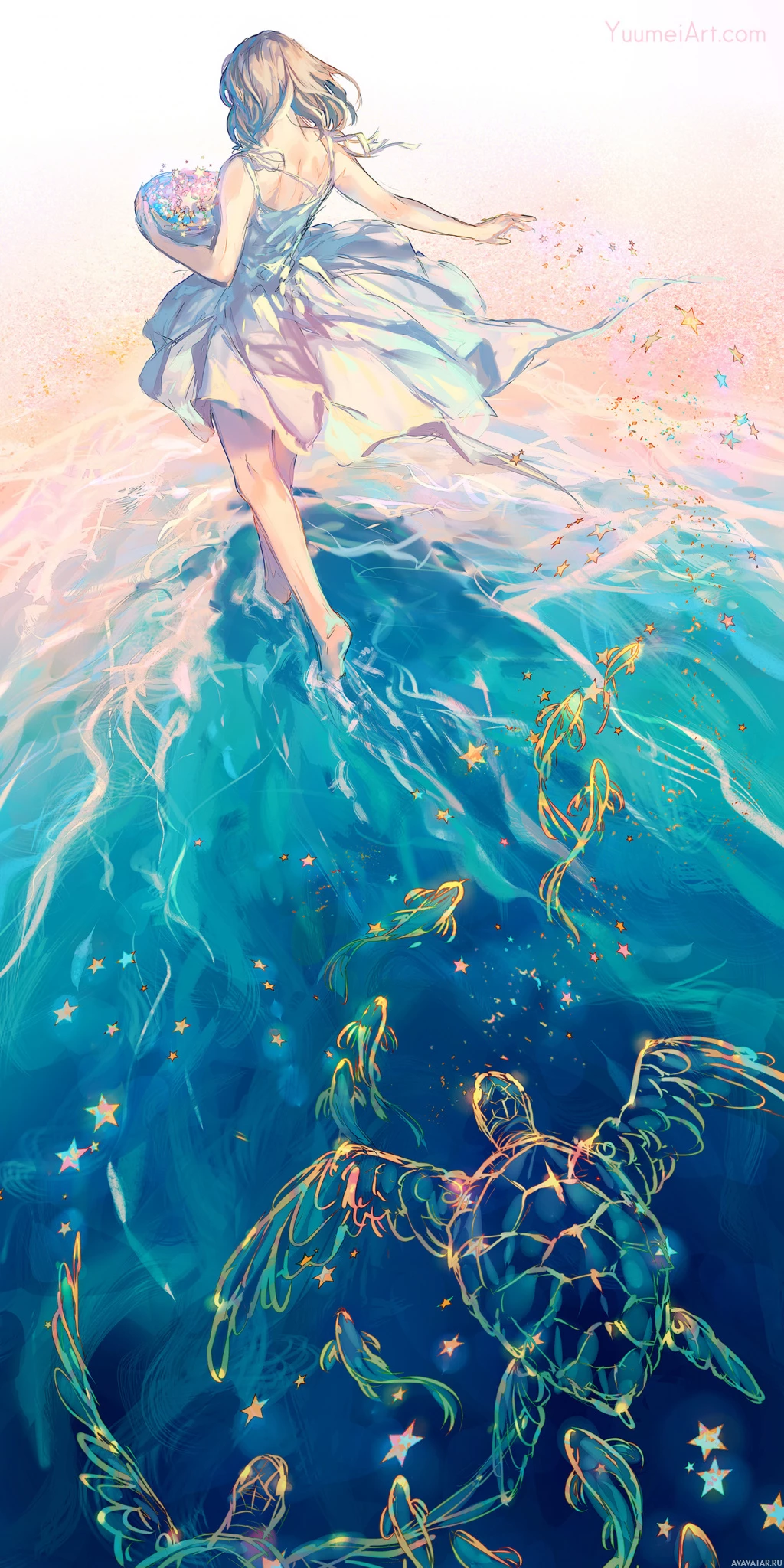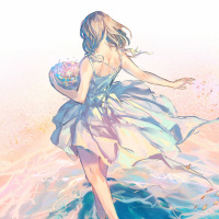 a young girl with long, wavy hair. She is wearing what looks like a dress that could be associated with fantasy or mermaid-like motifs, given the tail and the style of the outfit. The background depicts a body of water with bubbles rising from below, suggesting movement or
