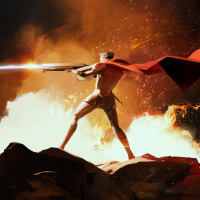 light in the background, suggesting action or conflict. The individual's stance and expression convey a sense of strength and determination, possibly portraying