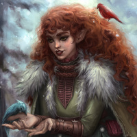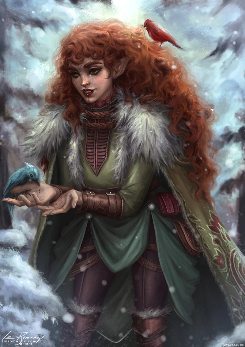 a blue bird, which is commonly associated with elves in fantasy stories. The background features snowy conditions, suggesting a wintry environment typical of elven lands in many