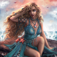 a fantasy character, which appears to be a female with long blonde hair and a fish-like tail. She is wearing what looks like underwater attire, including a bikini top and jewelry that might suggest she is a mermaid or some other