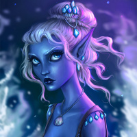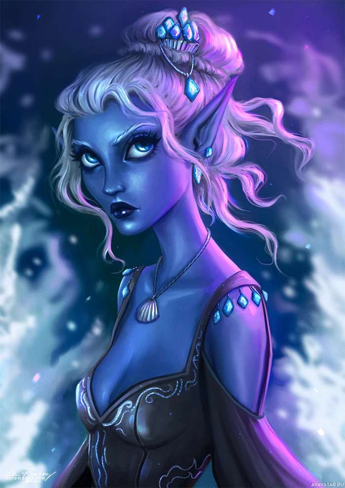 white hair, a blue skin tone, and is dressed in a costume that resembles typical elven or drow attire often found in fantasy settings. The background includes what appears to be magical or underwater motifs with