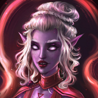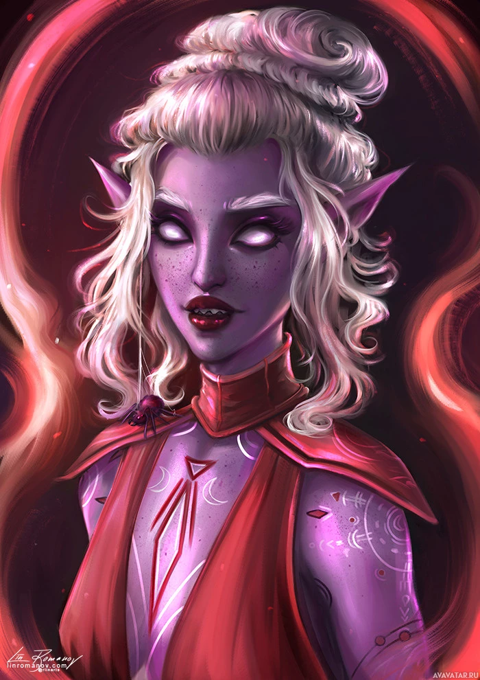 white hair and is wearing what appears to be magical or mystical armor with a red hue, adorned with intricate designs that suggest otherworldly powers or abilities. She also has pointed ears typical of drow, which are a race known for their dark skin tone and distinct features in Dungeons & Dragons lore. The character is presented against a backdrop that emits red light, enhancing