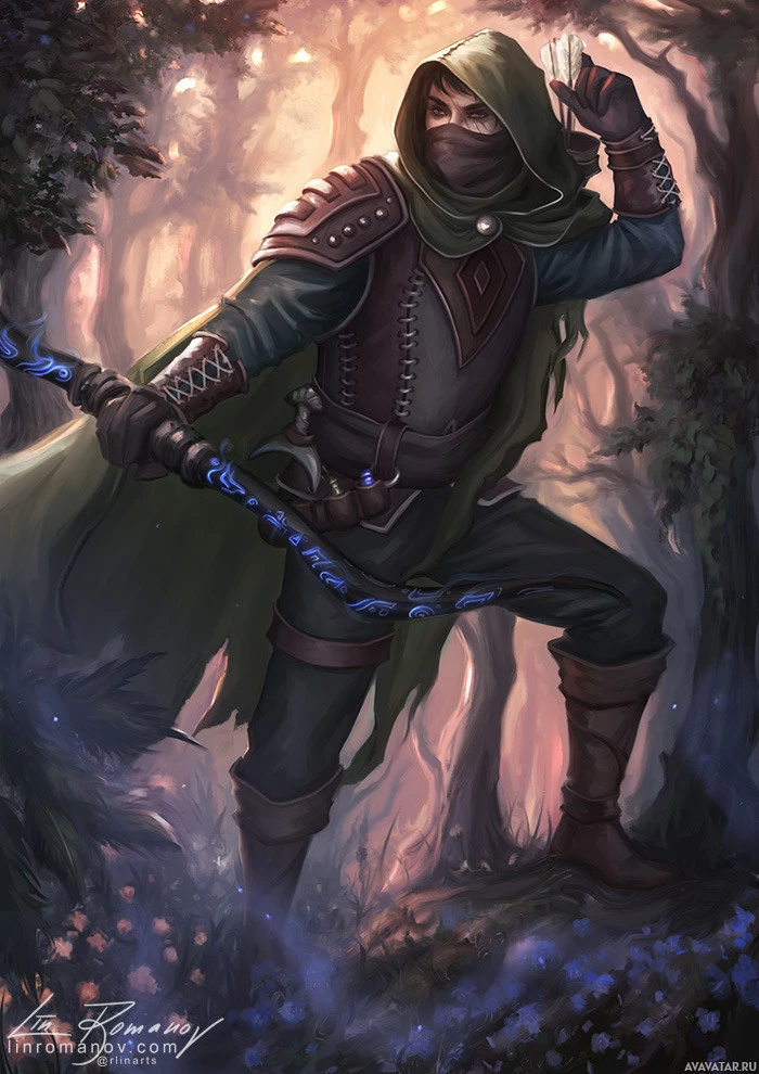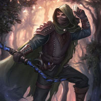 The image features an illustration of a character dressed in fantasy-style attire. This individual is wearing a hood, which suggests they might be using it for protection or concealment, and has a bow in their hand. They are also holding what appears to be a staff with a glowing blue crystal on the end, which could indicate magical properties within the context of the illustration's