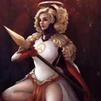 artistic rendition with detailed armor and wings that suggest an angelic theme. The character is holding a staff that resembles a lance. Her pose is dynamic, with one foot lifted off the ground, suggesting movement or action. The background has a dark and moody atmosphere, which contrasts with her light-colored armor and