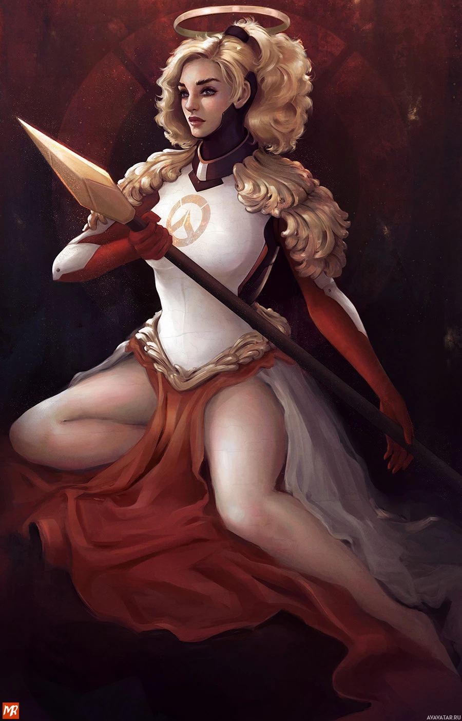 The image shows a character from the game Overwatch, known as Mercy. She is depicted in a stylized