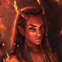 dark hair, pointed ears, and red eyes, which are often associated with demons in various forms of media. They're wearing what looks like a costume that could suggest