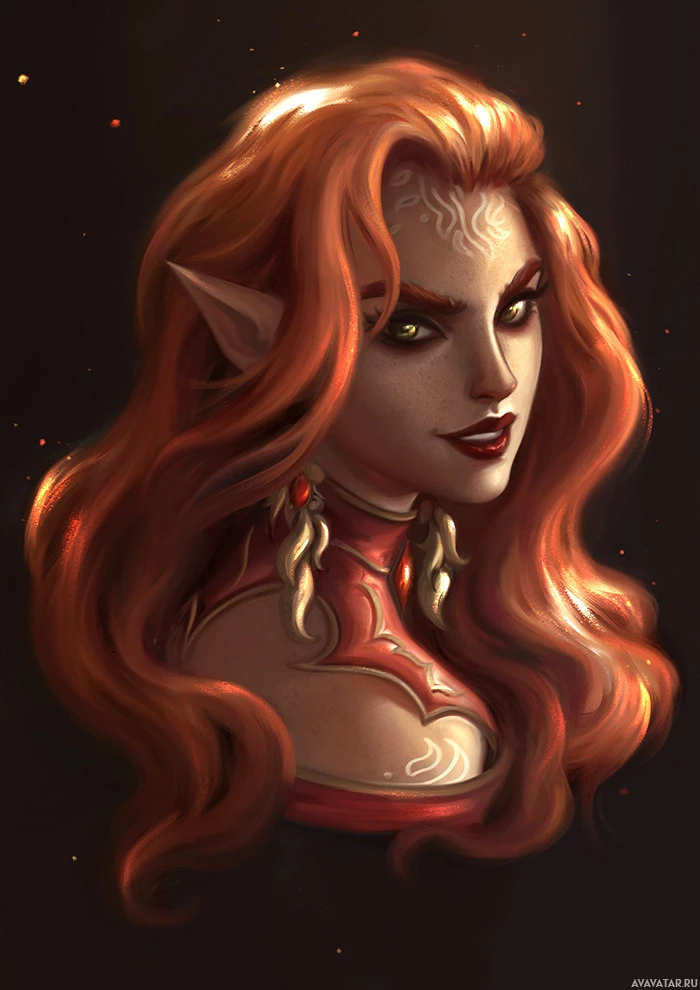 red hair and pointed ears, suggesting that she might be an elf, a common archetype in fantasy genres. She has an intricate design on her face, possibly indicating some form of mysticism or power within
