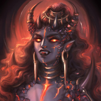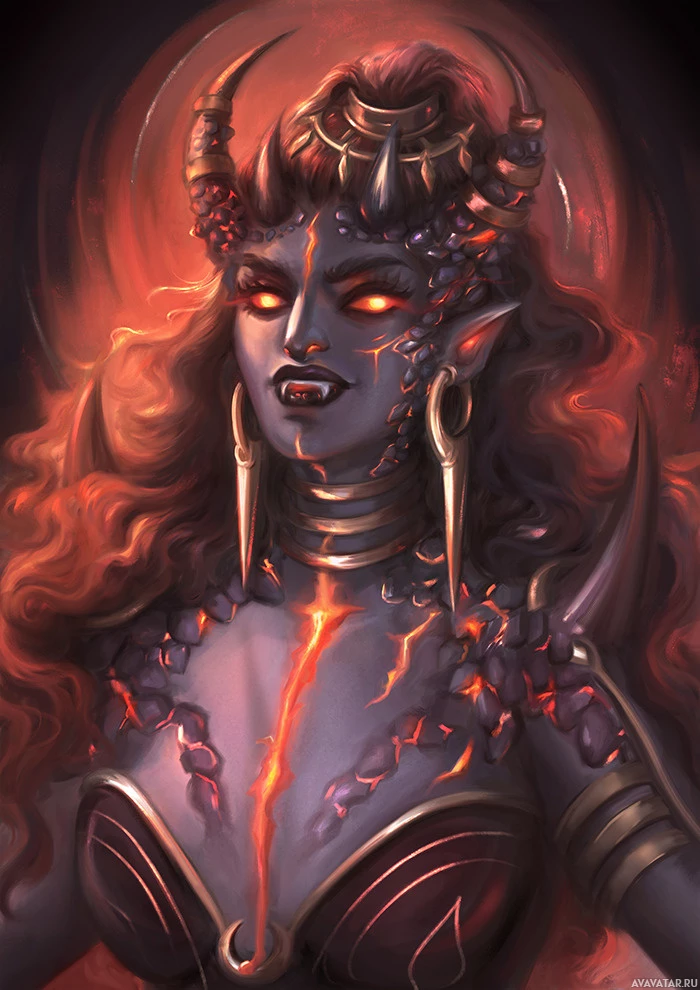 The image features a character that appears to be a demon, with various fantasy elements. She has horns and is adorned with jewelry and armor, suggesting she might be a powerful entity or warrior within